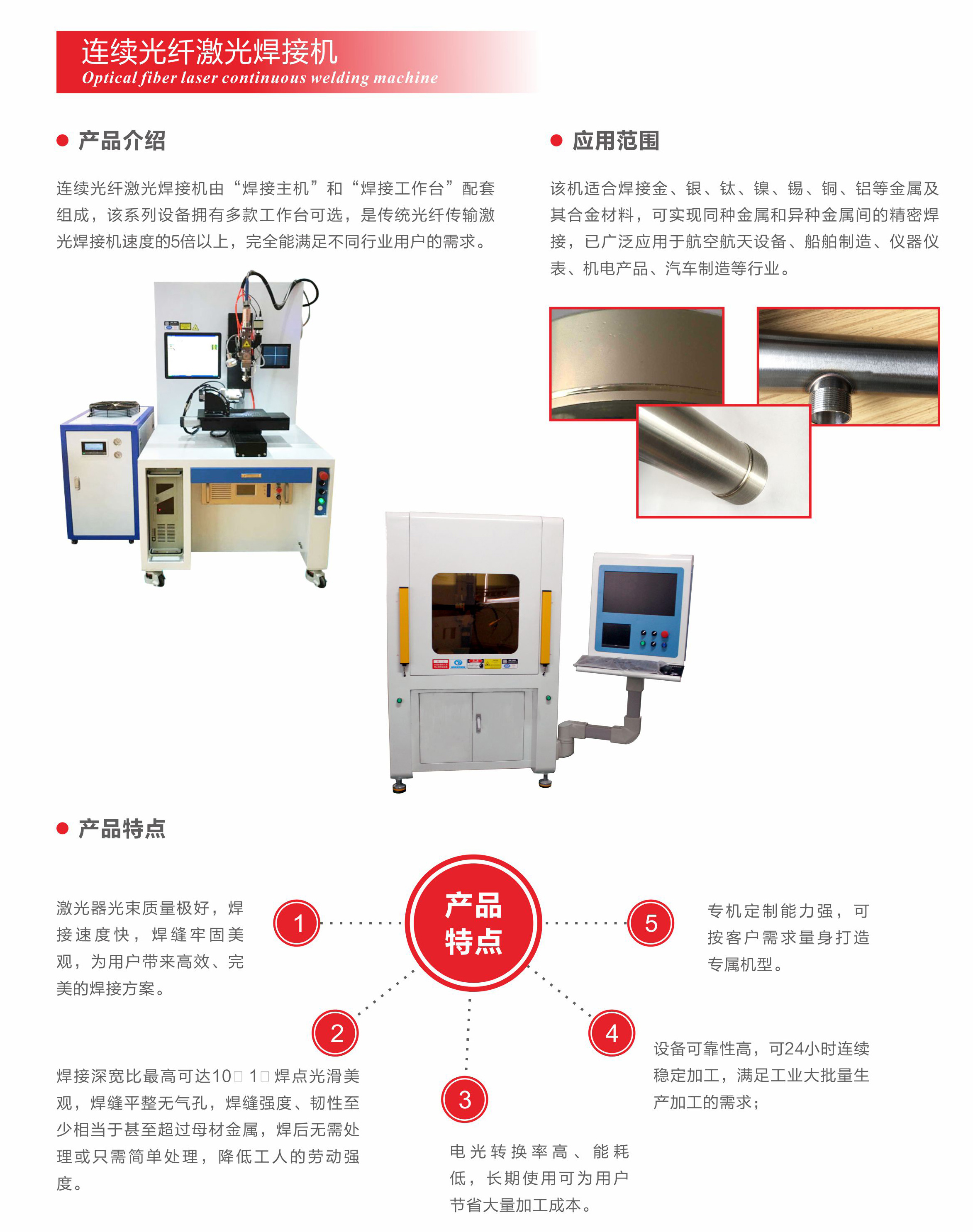 ●?焊接深寬比最高可達10:1,焊點光滑美觀,焊縫平整無氣孔,焊縫強度、韌性至少相當于甚至超過母材金屬,焊后無需處理或只需簡單處理,降低工人的勞動強度;